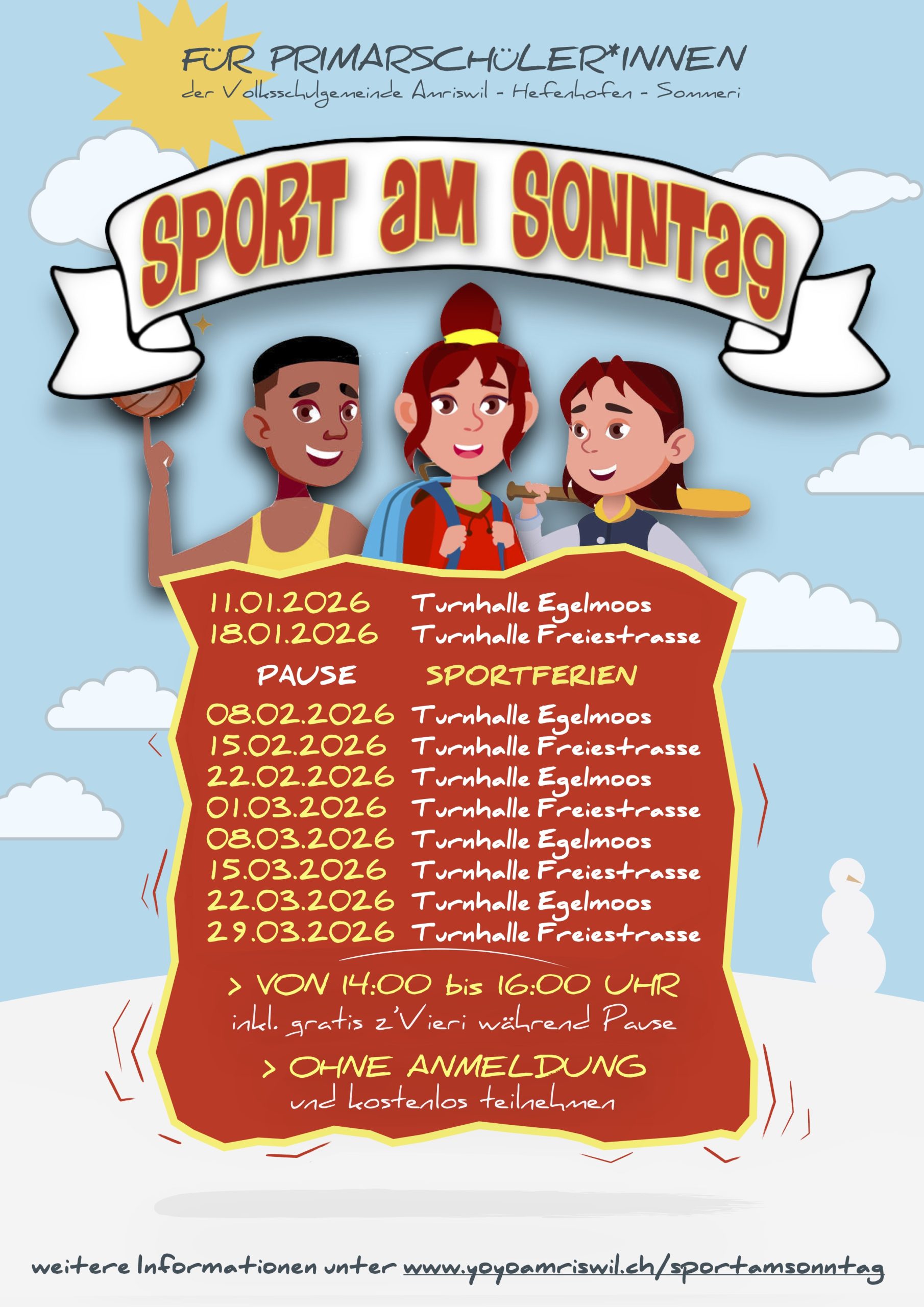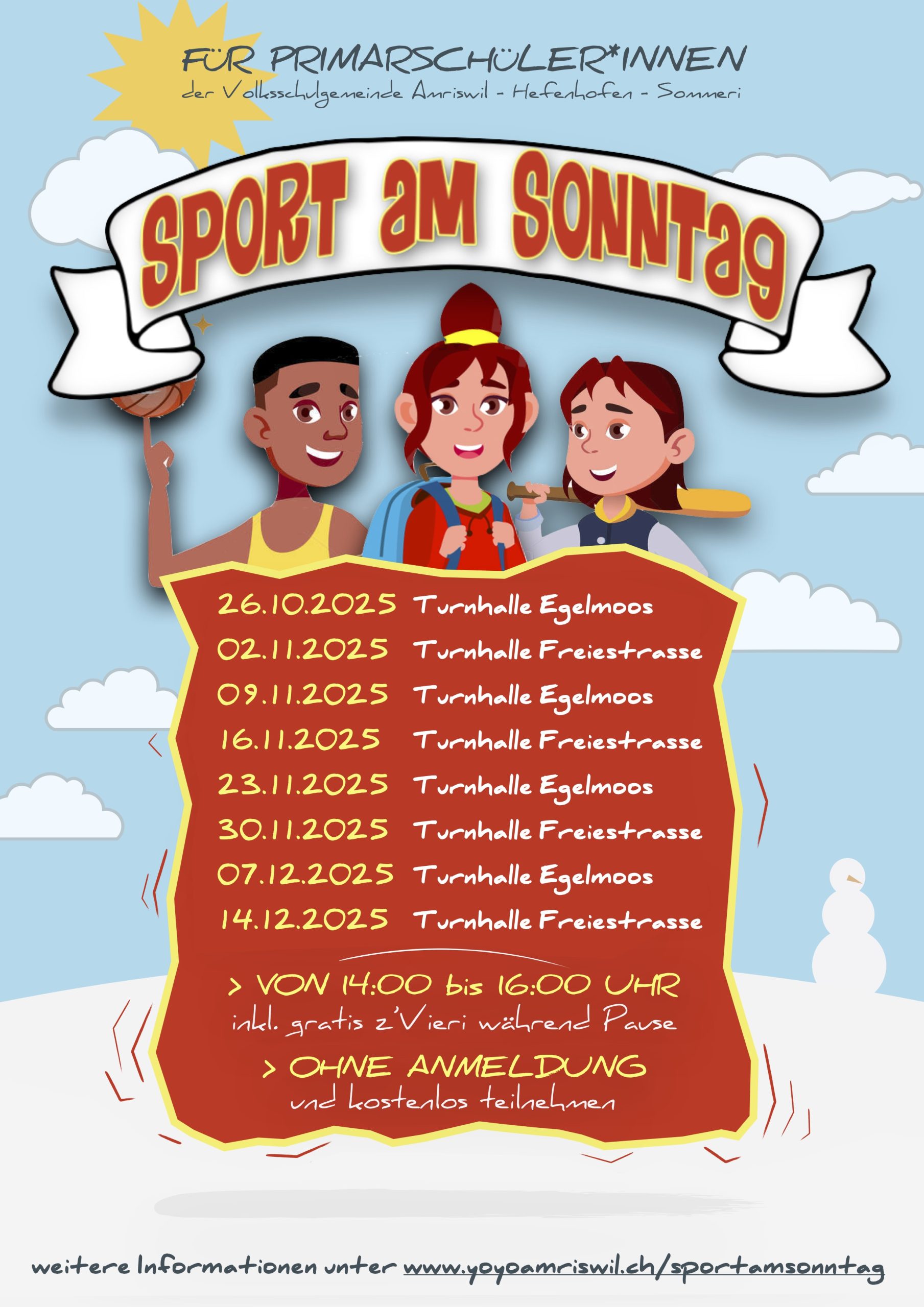 Während des Winterhalbjahres haben Primarschulkinder der Gemeinden Amriswil, Hefenhofen und Sommeri jeden Sonntagnachmittag von 14:00 bis 16:00 Uhr die Möglichkeit, sich in der Turnhalle sportlich zu betätigen. Den Kindern steht dabei eine breite Palette an Bewegungsmöglichkeiten zur Verfügung. Betreut werden die Kinder von erwachsenen Coaches aus den jeweiligen (Sport)Vereinen aus Amriswil und Umgebung oder vom YOYO-Team. Zudem sind immer zwei jugendliche Coaches des YOYO-Betriebteams vor Ort, welche die Sportvereine während den Events und beim Vor- und Nachbereiten unterstützen und zudem den z’Vieri organisieren und bereit stellen.